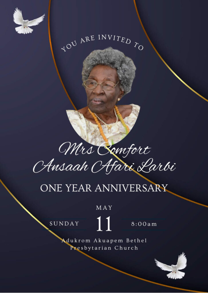 Madam Comfort Ansaah Afari Larbi’s journey reached its peaceful conclusion after a brief illness. She passed away at the remarkable age of 102 on August 10, 2023, at the Tetteh Quarshie Memorial Hospital at Mampong-Akwapim. Her legacy of hard work, respect, discipline, and unwavering faith in God will forever inspire her children, grandchildren, in-laws, and all who had the privilege of knowing her. To God’s eternal glory, she now rests in peace.